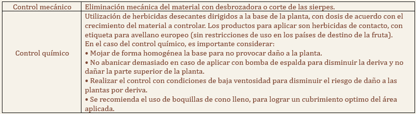 El control de las sierpes es una labor importante dentro de los manejos del avellano, principalmente por necesidad técnica de mantener libre la parte baja del árbol para optimizar las labores de cosecha, no tener un emboscamiento en el futuro con material mal posicionado y quitar material que consumirá energía aprovechable por la parte alta de la planta (zona productiva). Las alternativas de control de sierpes pueden ser: