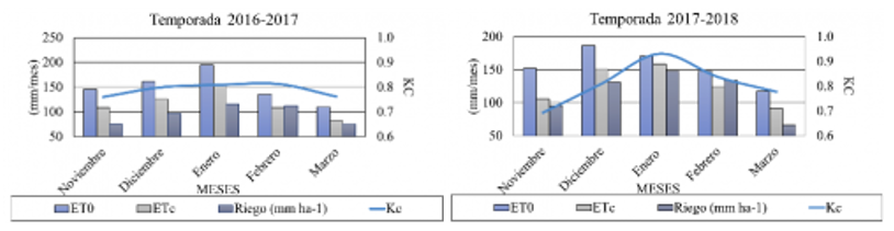 Gráfico 2: Coeficiente de cultivo (Kc) y consumo hídrico mensual temporada 2017-2018 (Citra, 2018).