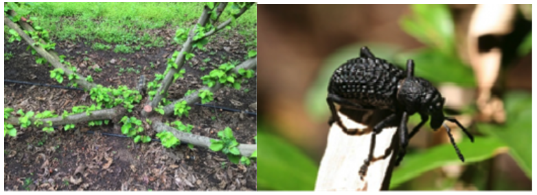 - Cabe destacar que el daño provocado por los adultos, aunque no tenga relevancia desde el punto de vista económico, representa una buena señal de presencia de ataque a nivel subterráneo, de hecho, las larvas son mucho más peligrosas para nuestros huertos que los adultos, ya que atacan de forma subterránea haciendo galerías a la altura del cuello de la planta, provocando amarillez de las hojas y defoliación temprana, esto combinado provoca la caída de ramas, ejes productivos, y en casos extremos, pérdidas de plantas completas. Para esos casos, una alternativa de recuperación es eliminar el material dañado o perdido y renovar con brotes basales nuevos, seleccionando buen material y en posición para cubrir los sectores perdidos.